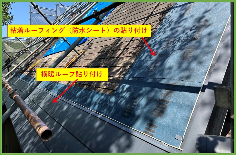 工事範囲は切妻屋根部と下屋であり、弊社は既存のカラーベストを剥がした後の屋根貼り付け工事を請け負い、横暖ルーフを貼り付けしました。