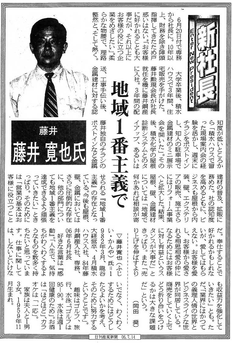 日刊産業新聞(平成18年7月14日)の新社長の特集に掲載されました。
