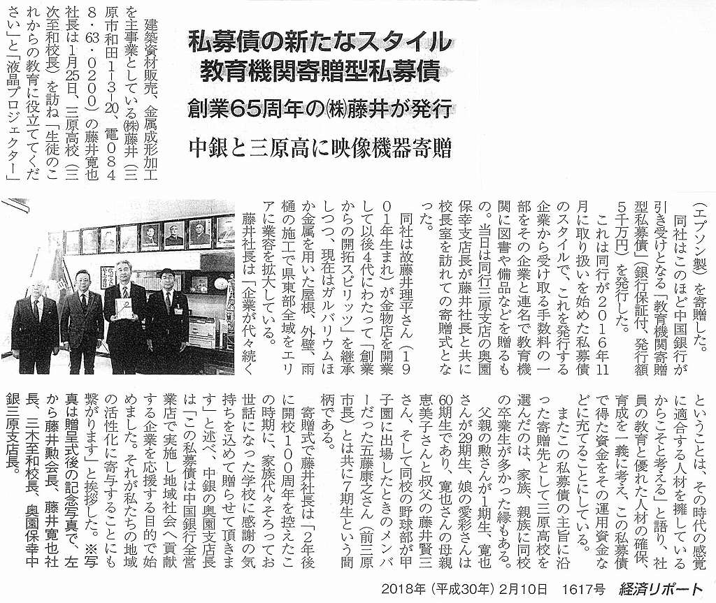 創業65周年の(株)藤井が映像機器寄贈についてのリポートが掲載されました。