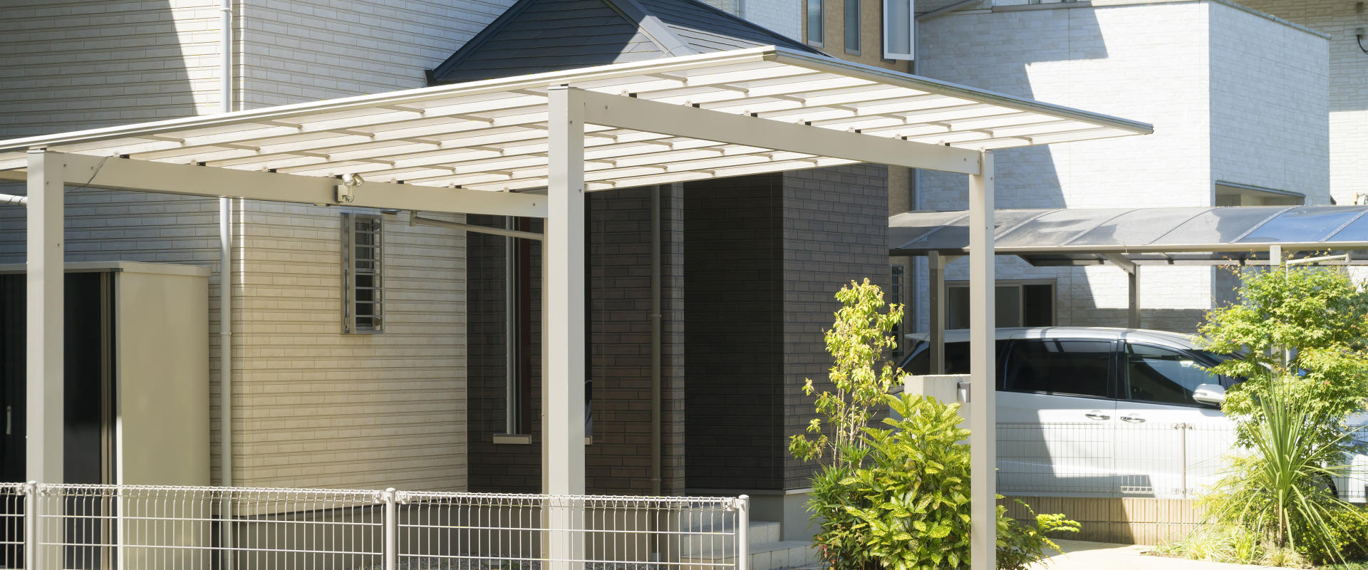 駐車スペースは、できれば玄関や勝手口から傘をささなくても出入りできるようにしておくと便利です。アプローチまで合わせて計画できるシステムタイプのカーポートは、敷地形状に合わせて選べるのでおすすめです。カーゲートやシャッターも含めてプランニングしましょう。