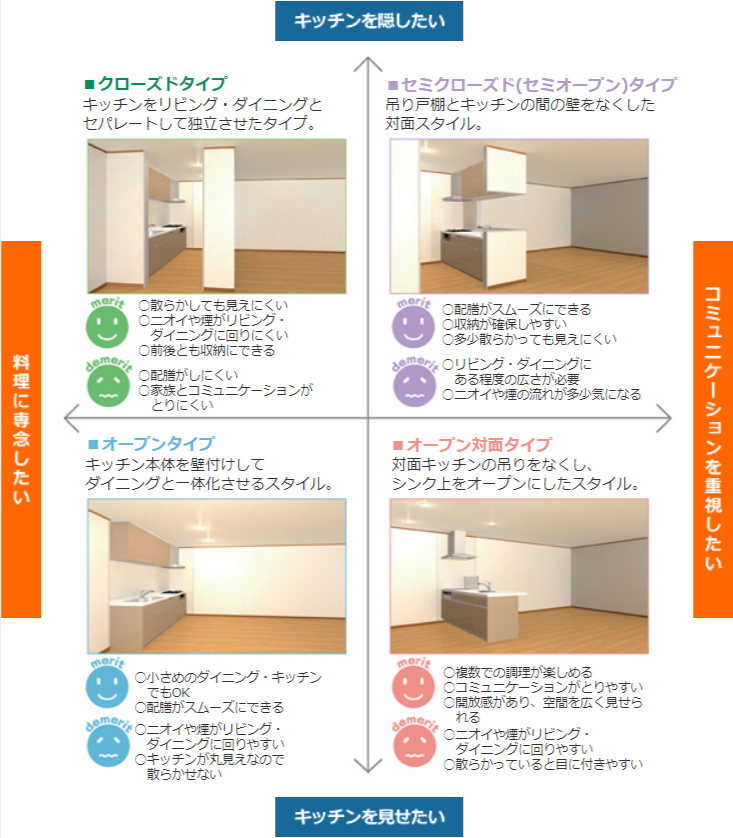 キッチンは、ダイニングやリビングなどとどうつなげるかで使い方が変わります。決め手は、どこまで隠したいのか見せたいのか、また料理に専念したいのか、家族との交流を重視したいのかなど。併せて、ニオイや音も考慮して。