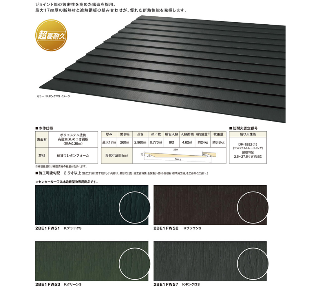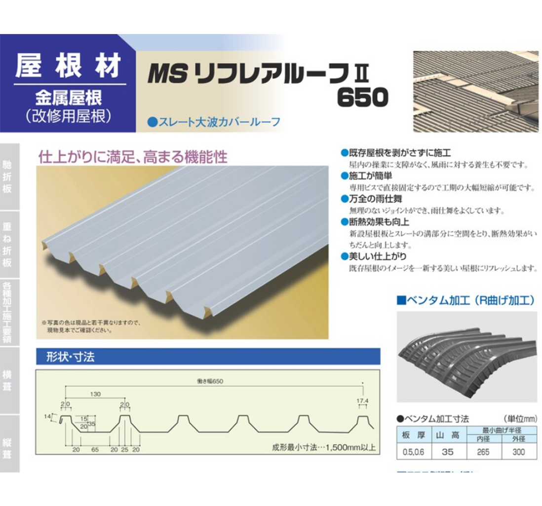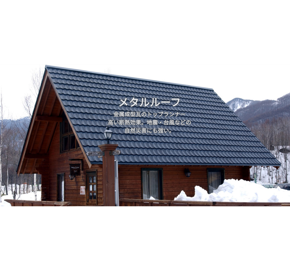 一番の特色は他の建材に比べて、圧倒的に軽くて強い事、そして雨漏れしにくい事、屋根や外壁の形状(例えば円形など)に合わせた加工が可能な上、日本瓦やスレートのように割れる心配が無く長期にわたって建物を保護します。