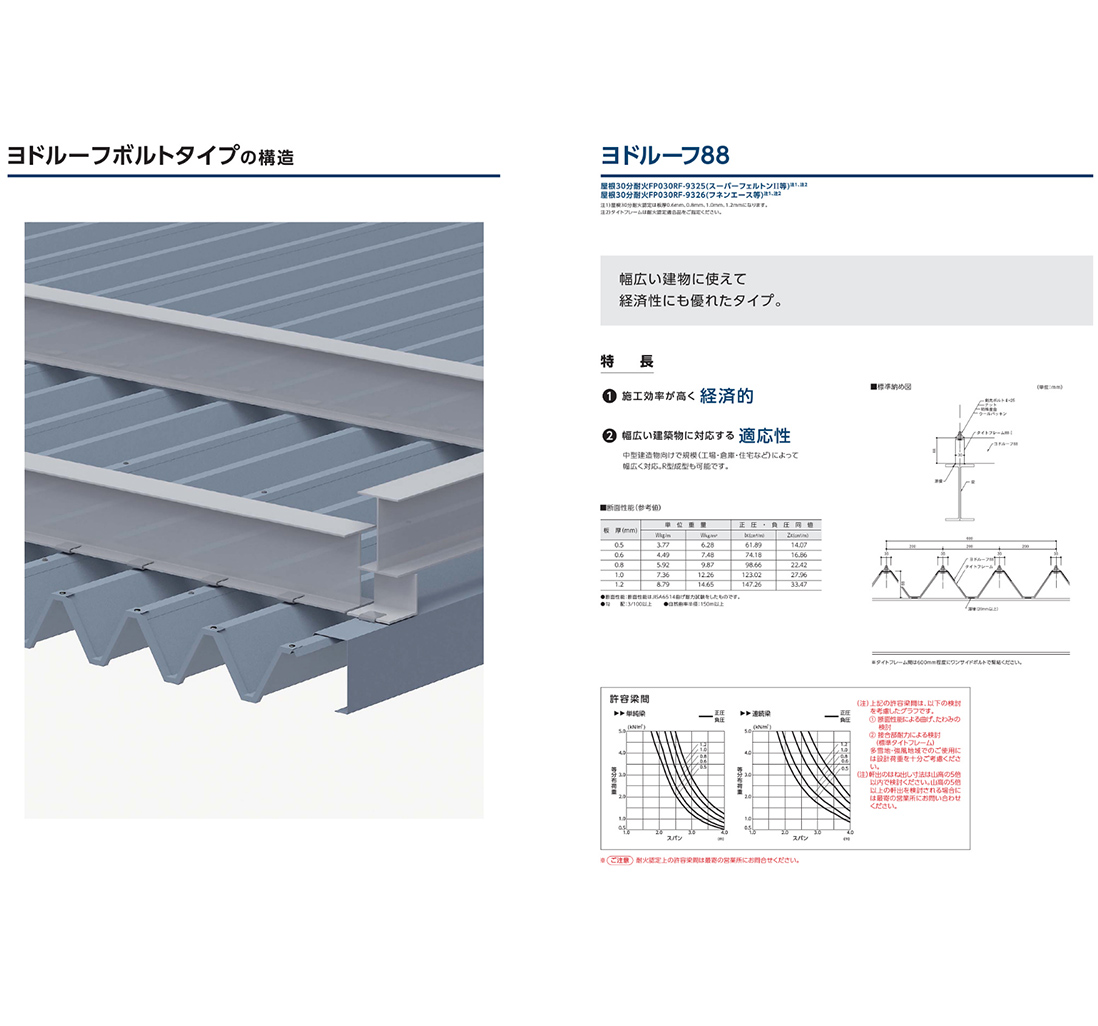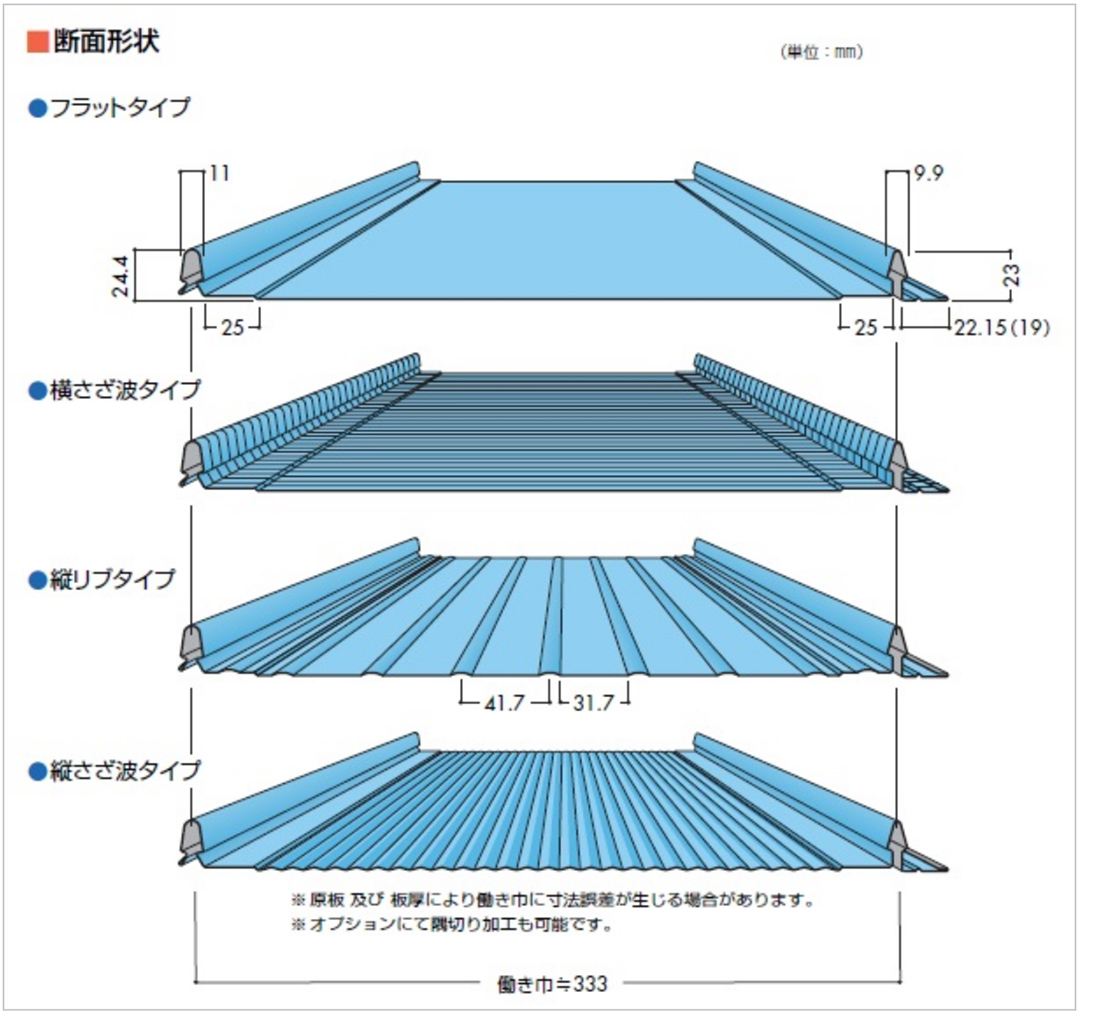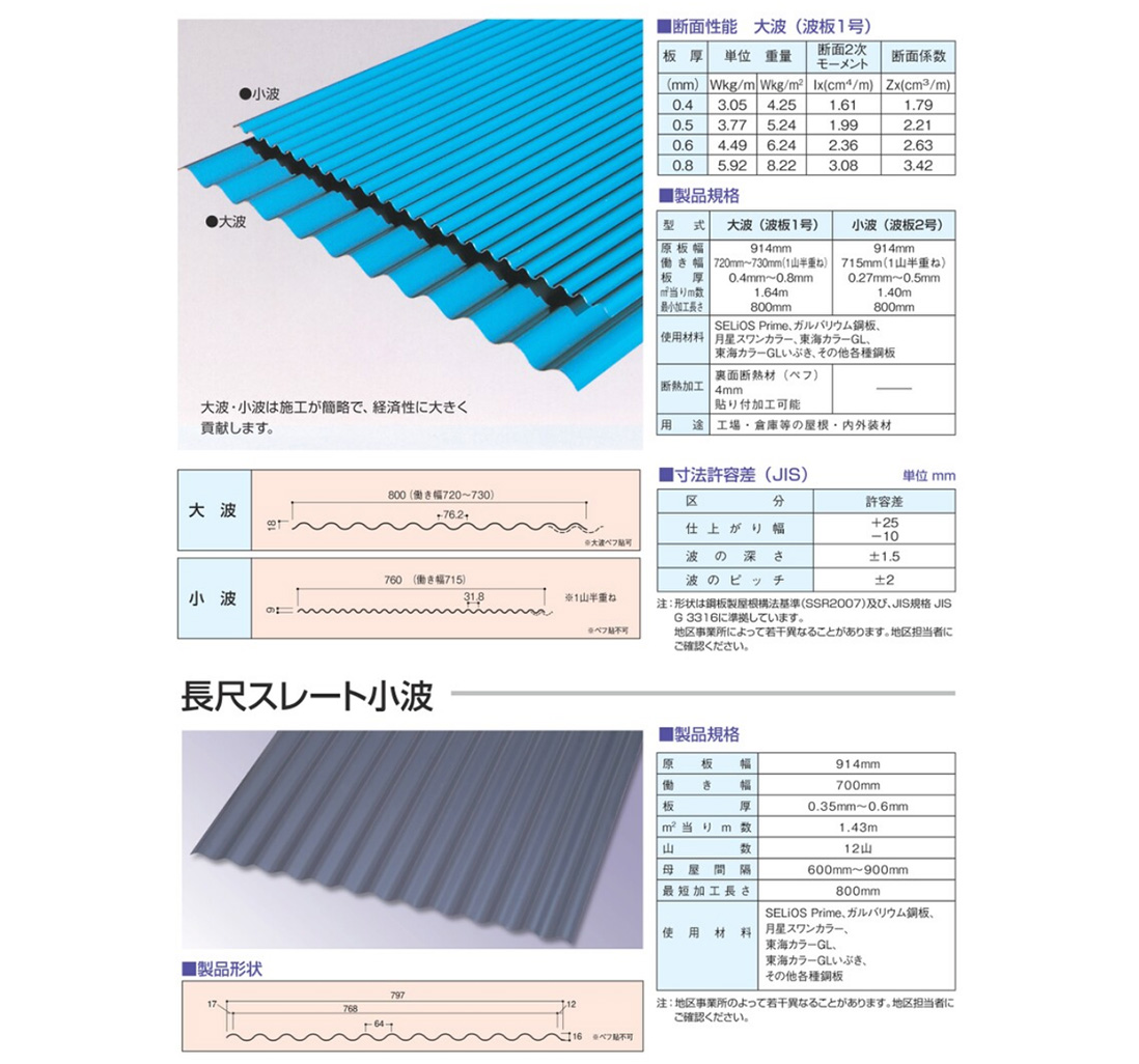 一番の特色は他の建材に比べて、圧倒的に軽くて強い事、そして雨漏れしにくい事、屋根や外壁の形状(例えば円形など)に合わせた加工が可能な上、日本瓦やスレートのように割れる心配が無く長期にわたって建物を保護します。